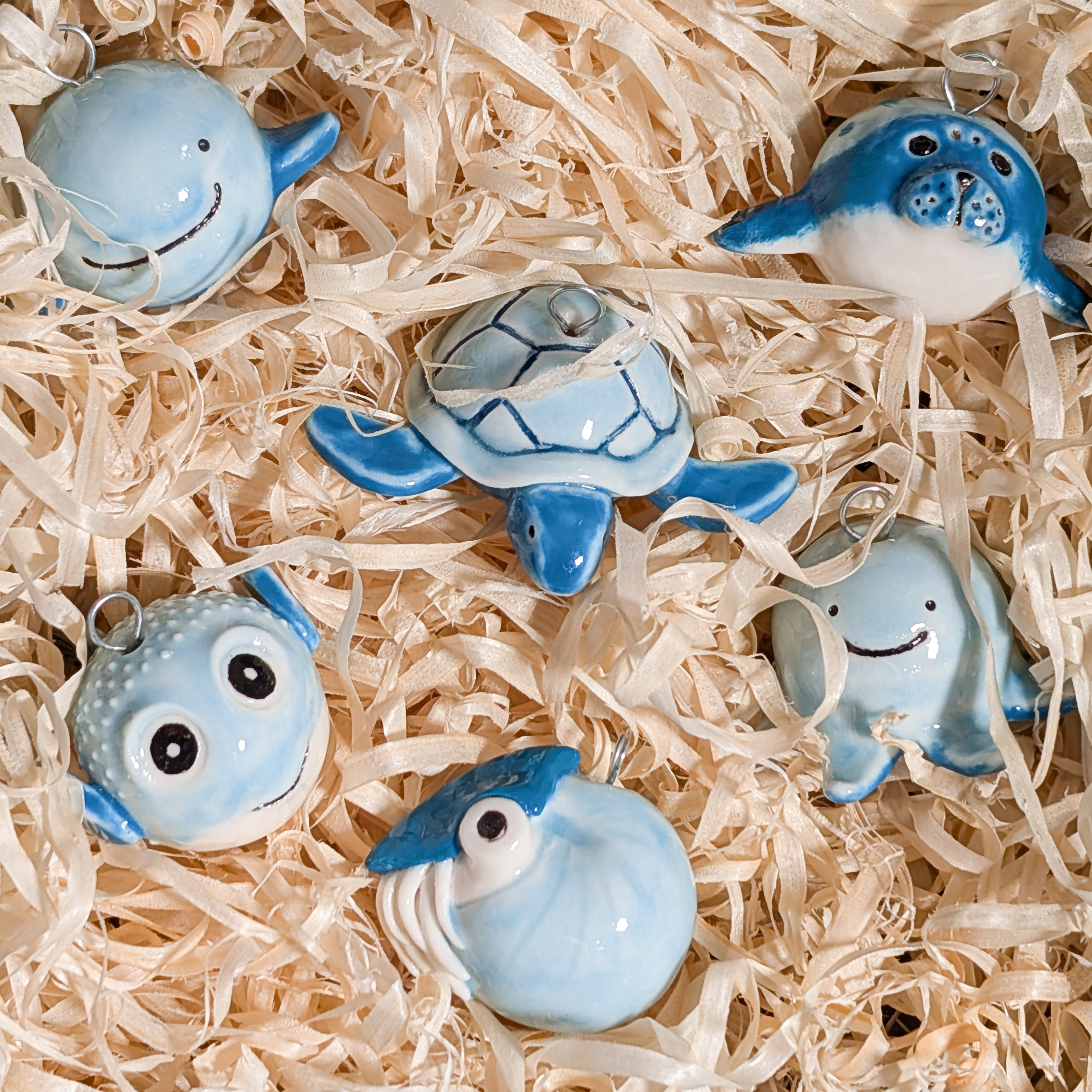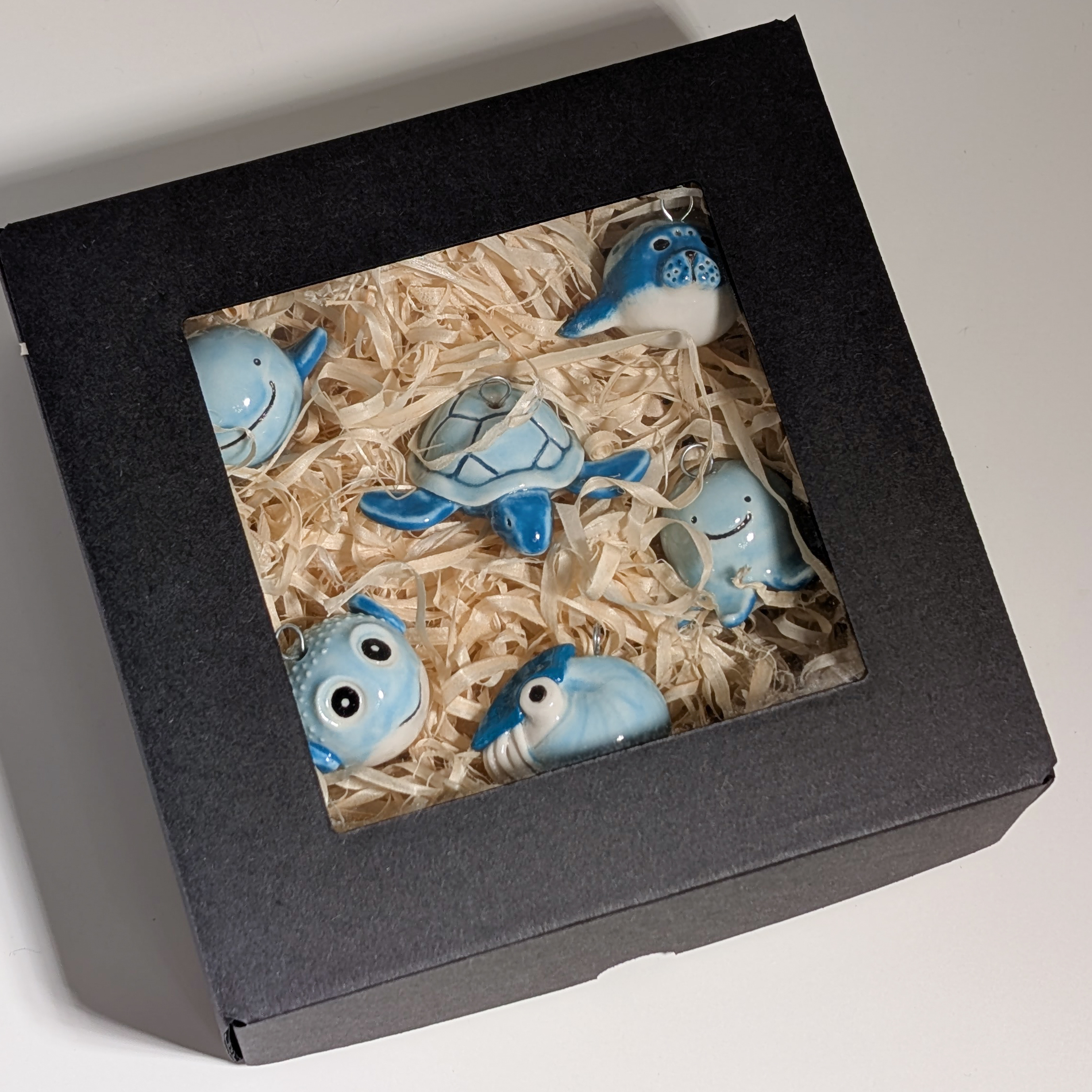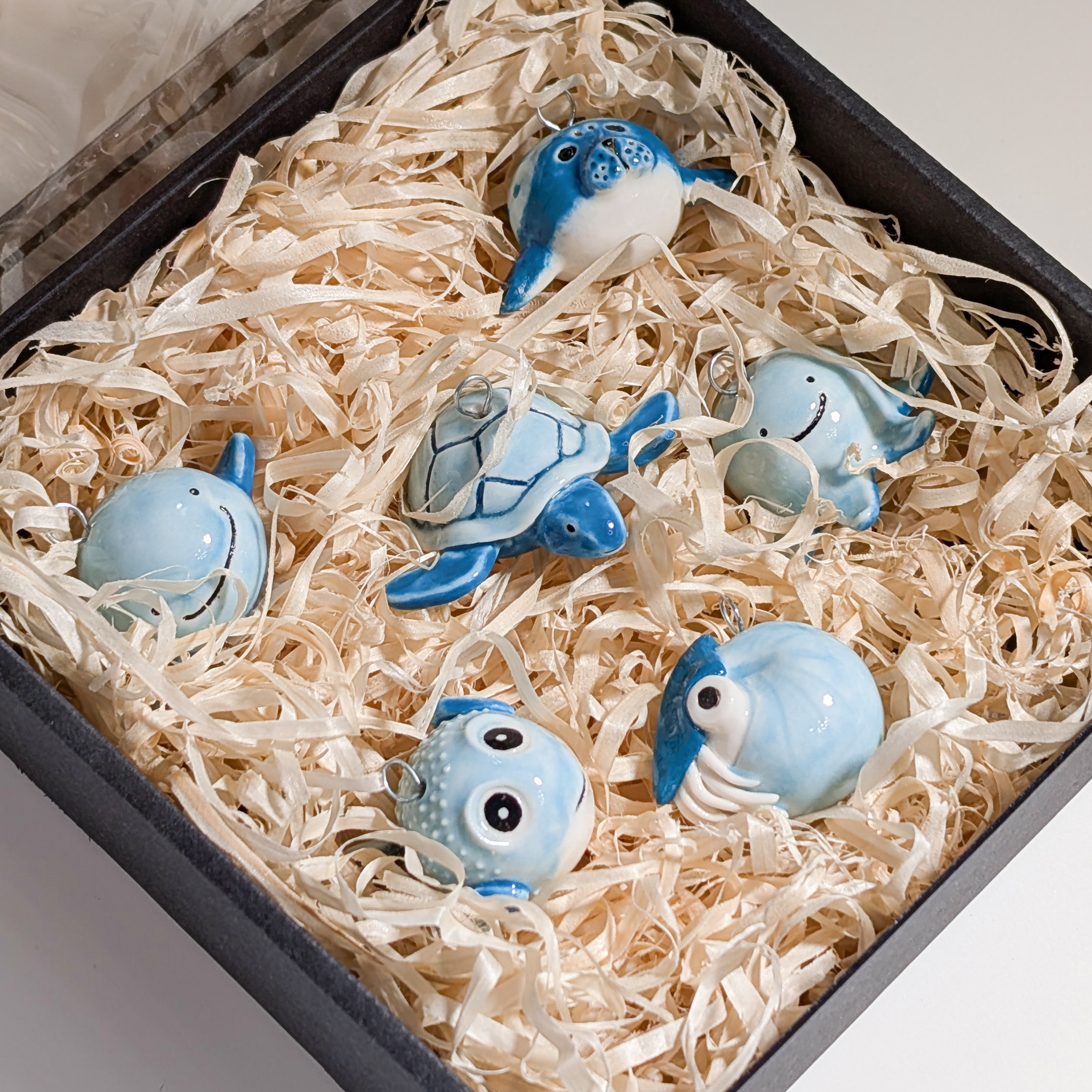 Each peace is individually shaped and glazed by hand. This make each one unique. The set includes six sea-themed decorations — perfect gifts for ocean lovers.