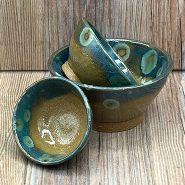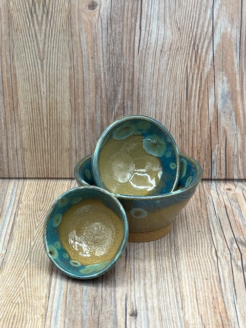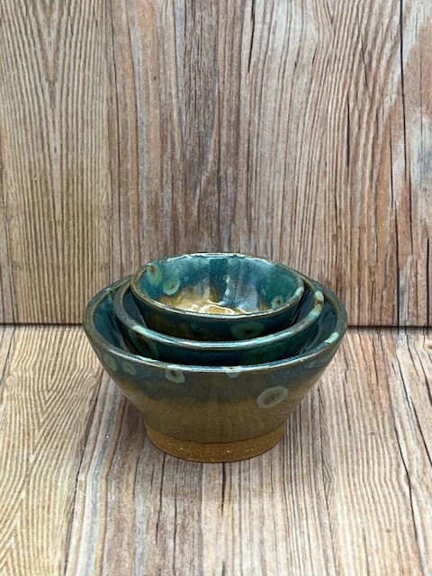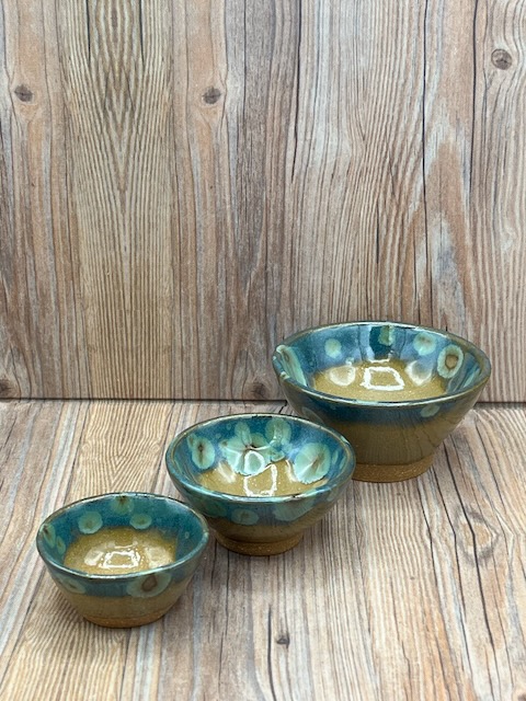 Set of 3 Small Teal and Olive Speckled Bowls with a Gloss Finish, in graduated sizes. Perfect for ingredients for cooking!